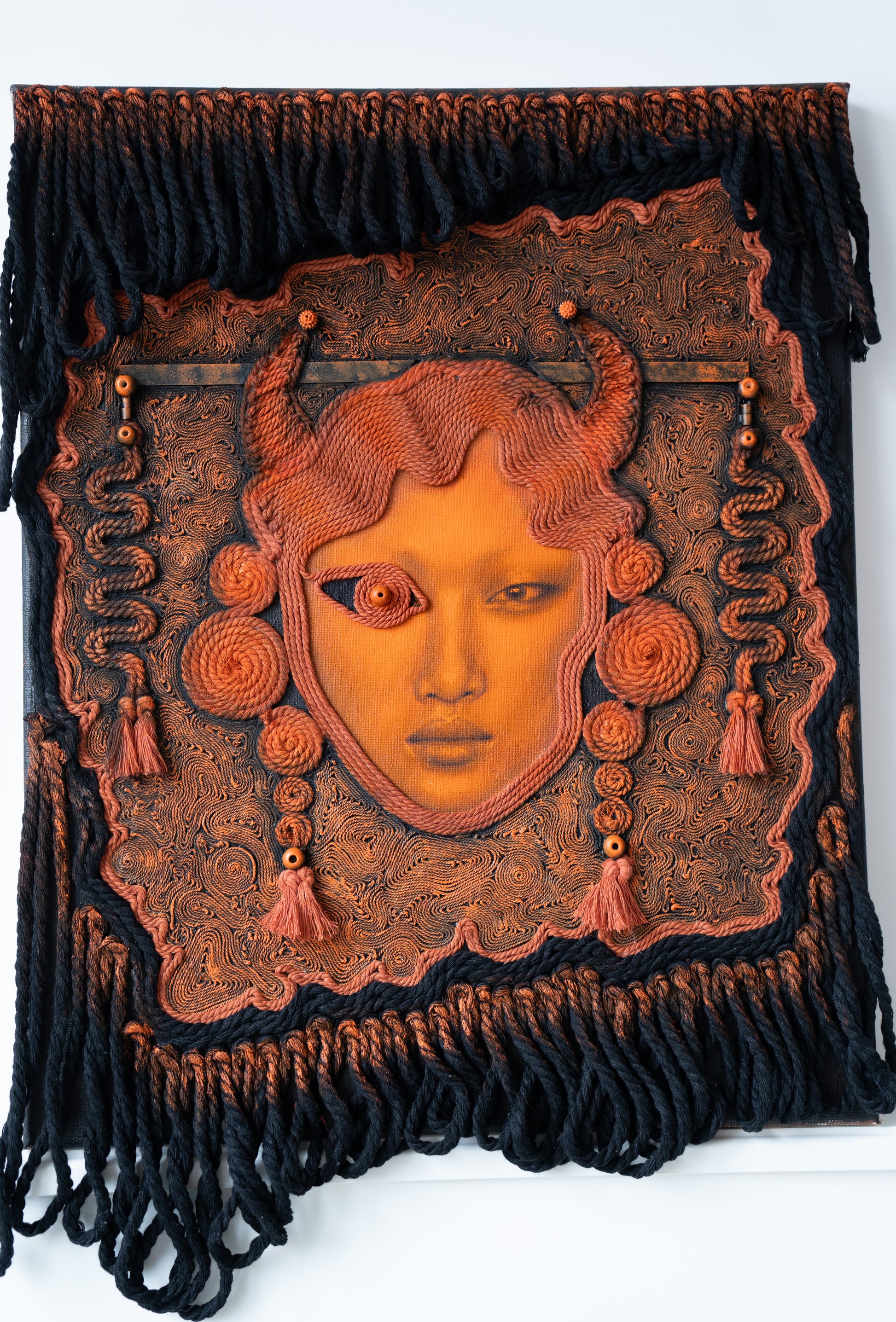 This unique mixed-media artwork combines hand-painted oil and acrylic techniques with intricate rope weaving, creating a striking three-dimensional tapestry-like effect. The piece features a central face framed by elaborate patterns and textured knots, blending mythological symbolism with modern textile art.